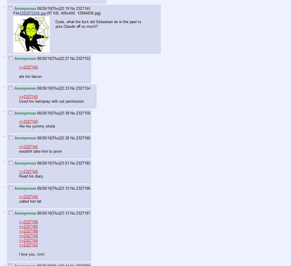 So far, my theory about Claude not really liking Alois came to be pretty much true, seeing as how he called him low-class, then brutally killed him.